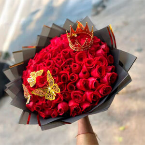 Bouquet of 100 roses with wreath and ribbon